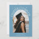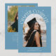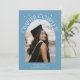 Cartão de foto de anúncio de formatura moderno e caprichoso com uma foto emoldurada arqueada na frente e 1 no verso. O texto diz "Capítulo Concluído" com estrelas desenhadas à mão. Adicione o nome do graduado, informações e mensagem para personalizar este cartão. Fundo azul jeans.