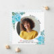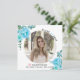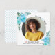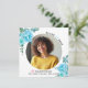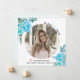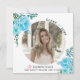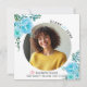 Folhas azuis de Aqua Classe de anúncio de graduação em 2025. Um bonito design que mostra uma foto, flores aqua azuis de aqua nos cantos superior esquerdo e inferior direito, o texto "Classe de 2025" e um boné de formatura rosa. O verso inclui um padrão de bolinhas em azul e branco.