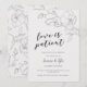 Cartão de anúncio de adiamento de casamento elegante e moderno com ilustração desenhada à mão de flores de magnólia em cores marfim e cinza com texto em caligrafia abaixo que diz "o amor é paciente."