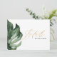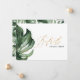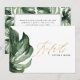 Cartão de detalhes de casamento com folhagem tropical de folha de palmeira em aquarela. Um design elegante, parte de uma coleção de casamento moderna minimalista atual. Com texto em script com efeito dourado.