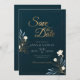 Um anúncio formal e elegante de salvar a data com letras douradas e flores brancas contra um fundo escuro. O cartão é fácil de personalizar com sua redação, fonte e cor da fonte. Não é exatamente o que você está procurando? Todos os nossos produtos podem ser personalizados para atender às suas necessidades sem custo adicional. Basta entrar em contato conosco em askpixieprints@aol.com. Produtos coordenados disponíveis a seu pedido.