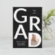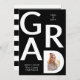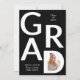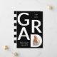 Formando branco moderno na classe negra de 2025 com anúncio de graduação de fotos. Ele apresenta o texto "FORMANDO", uma foto na letra D e seus detalhes e listras em preto e branco no verso.