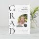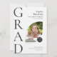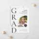 Este anúncio de graduação em forma plana de 5" x 7" apresenta um design de arco com duas fotos, uma na frente, outra na parte traseira, em preto e branco. Os espaços reservados incluem, nome do formando, nome do colégio ou da universidade, o tipo de escola, o diploma e uma linha adicional para informações adicionais, como honras especiais ou enfoque no grau.
