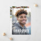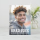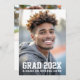 Anúncio de graduação com sua foto e o texto "formando" e seu ano em uma fonte de esportes universitários com seu nome ou escola abaixo. Foto adicional e mensagem personalizada no verso. Texto preto sobre fundo branco.