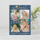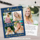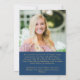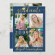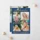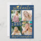 Anúncio de graduação simples e moderno, apresentando falso roteiro de caligrafia em ouro metálico e boné de formatura e personalizado com 4 fotos na frente (1 no verso) contra uma cor azul editável de fundo. O ano de aula também é editável. O verso apresenta uma foto de sangria de cheio e seu texto personalizado para obter detalhes sobre seu formando. ASSISTÊNCIA: Para obter ajuda sobre modificação ou personalização do design, alteração de cor, transferência do design para outro produto ou se você quiser coordenar itens, entre em contato com o designer ANTES DE PEDIR por meio do Zazzle Chat ou makeitaboutyoustore@gmail.com.