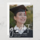 O anúncio de graduação elegante apresenta duas fotos da faculdade ou do formando segundo grau. Graduação Cartão de lançamento com foto de retrato sangrado do cheio de fonte manuscrito na frente com nome e detalhes de graduação. O verso tem uma segunda foto com detalhes adicionais. Clique no botão editar para personalizar este design.