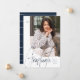 Comemore seu formando com este anúncio moderno de graduação de fotos em um esquema de cores azul e branco marinho. Apresentando uma forma de foto exclusiva com uma borda curvada na frente, este anúncio de graduação também tem um ousado script moderno "formando" e texto personalizável para o nome e o ano do formando. O marinho back apresenta e uma faixa de coordenação, uma segunda foto e um texto personalizável para planos futuros, convite da parte de formando e muito mais. Este anúncio original do formando de Lea Delaveris também está disponível como um convite festa de formatura e faz parte de uma coleção de anúncios de graduação, suprimentos partidários, decoração, presentes e muito mais. Encontre mais estilos e cores na coleção. Também disponível como download de anúncio de graduação digital!