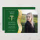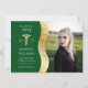 Comemore seu formando de pós-graduação favorito com este design de fotos "Formando" verde-escuro e tom de ouro. A modelo apresenta uma visão ondulada do lado esquerdo com a palavra "Formando" no fundo da onda dourada acompanhada de um recorte de tom dourado com "M" e "D" de ouro plano, para o ano de classe esquerda e formando, nome e escola de branco. Design por Holiday Hearts Designs (direitos reservados) com o crédito de foto marcador para Mike Austin via Unsplash.