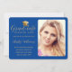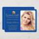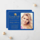 Este anúncio personalizado de formatura universitária mostra sua foto com uma moderna fronteira real azul arredondada. À esquerda, no faux gold script, está a palavra "Formando", realçada por um boné de formatura de ouro com o seu nome, grau, escola, ano e data a personalizar. Desenhada por Susan Coffey.