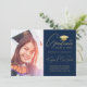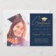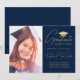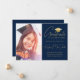 Envie a sua família e amigos um cartão de formandos personalizado único para os fazer. Este design modelo apresenta sua foto personalizada à esquerda e à direita um boné de formando branco sentado na palavra "Formando" escrito em uma tipografia falsa dourada escrita à mão. Personalize sua classe/ano, nome, grau e outros detalhes da cerimônia em um histórico clássico azul-marinho. Desenhada por Susan Coffey.