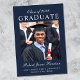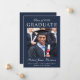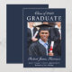 Anúncio de formatura simples e elegante em azul escuro para faculdade, apresentando uma foto do graduado, seu nome e ano de turma em letra cursiva branca e sua universidade, curso e honrarias em tipografia branca moderna.
