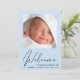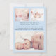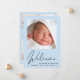 Um simples e fofo anúncio de nascimento de um bebê azul pastel. A frente apresenta a foto do seu recém-nascido, o nome do cheio, a data de chegada e as estatísticas de natalidade, e "Bem-vindo" em um roteiro de na moda. No verso, adicione três fotos adicionais e nomes de pais e irmãos, e um obrigado para você, visitação ou outra mensagem.