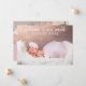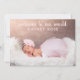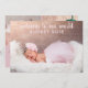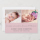 Lindo anúncio de nascimento duplo para sua filha. A frente apresenta uma grande foto do seu bebê com caligrafia rosa pincelada A face traseira rosa pincelada suave inclui espaço para duas fotos menores e informações pessoais, incluindo nome do bebê, estatísticas de natalidade, nomes de pais e mensagens