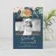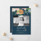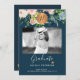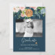 Pêssego cor-de-rosa-reluzente, marfim, e marinho azul de peônia, flores chic boho com folhagem, um pequeno boné de formando, e um círculo monograma de cobre metálico falso fazer um cartão de anúncio de graduação de glam moderno com um roteiro de tipografia em tom de giz completamente editável sobre um fundo azul escuro de marinho (cor variável). +++++++++++++ Fácil de personalizar com foto do formando, nome, monograma inicial, escola e ano de graduação!