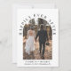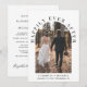 Elegante anúncio de casamento íntimo ou privado e convite de recepção. A frente apresenta a foto do seu dia de casamento em uma moldura arqueada e "Felizes para Sempre" em tipografia elegante. Adicione seus primeiros nomes, data e local do casamento. No verso, personalize o anúncio do casamento e os detalhes da recepção e adicione seus nomes em uma caligrafia semelhante a uma assinatura.