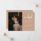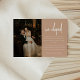 Anúncio de foto de casamento moderno bege 'Nós fugimos'. Personalize com sua foto de casamento favorita, sua mensagem de fuga para familiares e amigos, e as iniciais dos noivos no verso.