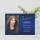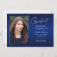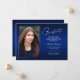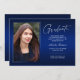 Dois cartões de anúncio de graduação, modernos e elegantes, de dupla face, com elementos design do texto moderno, com um único script de tinta de estilo manuscrito. As fotos do formando na parte frontal e traseira do cartão são acentuadas com uma delicada e minimalista placa de gradiente (a foto traseira está perfeitamente definida e pronta para ser emoldurada). O fundo é um design de gradiente especial, criando lindamente tons vibrantes de azul que vão da safira ao azul marinho profundo. A frente da placa oferece espaços de texto personalizados para informações sobre sua graduação ou pode ser reformulada para fazer desta placa um convite de festas de formando. Perfeito para o segundo grau, universitário e estudante de formando universitário.