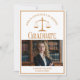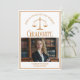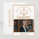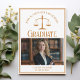 Este cartão de anúncio de formatura personalizado em dourado e branco apresenta uma tipografia sofisticada para um graduado da turma de 2026 acima da foto do seu aluno. Personalize com o ano de formatura sob as balanças da justiça e fotografia para um cartão de advogado ou advogado personalizado.