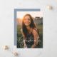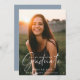 Tipografia elegante, cobertura de fotos de script branco, anúncio de graduação de fotos. A cor de fundo mostrada em azul empoeirado pode ser personalizada.