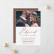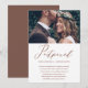 Elegante anúncio de remarcação de data de casamento. Este simples anúncio é uma maneira sofisticada de informar aos convidados que a data do seu casamento foi remarcada devido a circunstâncias imprevistas, e inclui a nova data do casamento. Este anúncio moderno apresenta uma bela caligrafia em script de falso cobre "adiado" em um fundo branco com a foto do casal, e um verso do cartão em marrom cobre.