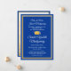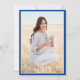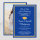Compartilhe a alegria de um segundo grau ou formandos com fotos personalizadas de anúncios azuis, dourados e brancos. Este modelo formal inclui nomes de pais e formandos, assim como qualquer texto de sua escolha, como detalhes de convite de festas, honras especiais, título de grau, citação de inspiração favorita, informações de contato do formando, planos educacionais futuros ou nova posição de emprego. Todo texto nesta modelo é simples de personalizar. A design azul e amarela apresenta um boné de conselho de argamassa, caligrafia elegante de script, tipografia tradicional clássica e uma foto de sua escolha, como uma foto de mais velho ou imagem da cerimônia de início. Observe que o ouro é impresso a cor, não a folha metálica. Estes cartões de anúncio de graduação são uma forma na moda para compartilhar sua celebração especial com a família e os amigos. Parabéns ao formando!