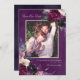 Flores românticas em tons de burgundy rico, lilás suave, roxo berinjela profundo e orquídea rosada se combinam com botânicos verdes modernos, como samambaias e eucalipto. Um fundo de aquarela roxo berinjela profundo une tudo com tipografia moderna elegante nestes cartões de salvar a data com foto.