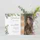 Impressione seus convidados com a beleza da natureza. Ramos de buxo em aquarela no topo e no canto inferior esquerdo com foto à direita. O script verde "Graduate" acentua a beleza natural e o verde escuro sólido no verso.