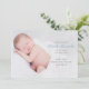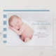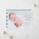 Um anúncio elegante de nascimento moderno para anunciar a chegada do seu novo bebê às pessoas mais importantes da sua vida. Personalize facilmente com uma foto favorita e todos os detalhes importantes, incluindo nome, data de nascimento, estatísticas de natalidade e nomes de pais em cinzas simples e tipografia azul. O verso é um padrão de faixa azul e esbranquiçada
