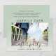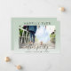 Convite chic de verde-sage para casamento íntimo ou anúncio de casamento privado e recepção de casamento ou festa de celebração. A frente apresenta sua foto, "Festa Feliz Para Sempre" em tipografia simples e um script moderno com floreios, e seus primeiros nomes e data de casamento. No verso, você pode personalizar seu anúncio de casamento e convite em mais detalhes e adicionar seus nomes em um script semelhante a uma assinatura.