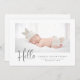 Um simples e na moda de carta de modelo de anúncio de nascimento com dois lados apresenta uma foto do seu bebê ou menina recém-nascido, mensagem personalizada que pode ser personalizada, texto tipográfico com letra de mão que diz "Olá" com um obrigado de script que você e o coração estão entre nós — acima de sua mensagem no verso. Você pode personalizar o nome do bebê e as estatísticas na frente e obrigado sua mensagem na parte traseira do cartão. Um lugar para uma segunda foto atrás. ©Marisu Valencia