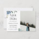 Flores de aquarela azul desbotado com folhagem botânica de jardim, cartão de save the date de casamento com foto. Projetado para combinar com nossa coleção botânica azul desbotado.