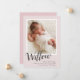 Este anúncio de nascimento minimalista apresenta uma grande fotografia e uma bonito caligrafia. O nome do seu novo bebê está escrito em carvões, em cartazes de cinza e sobrepõe sua foto favorita. Abaixo da caligrafia, adicione o nome do seu cheio, estatísticas de natalidade e seus nomes. O fundo da rosa claro na frente e o fundo rosa mais escuro na parte traseira da placa podem ser alterados se você quiser. Você também pode adicionar fotos adicionais e uma mensagem personalizada no verso.