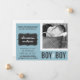 Anuncie o nascimento do seu novo bebê com este anúncio de nascimento azul e bonito com modelo fotográfico. Carregue sua própria foto, cortada/dimensionada conforme necessário e posicionada para ajustado atrás da estrutura branca. Em seguida, personalize os detalhes da data e hora de nascimento, e os orgulhosos irmãos e/ou pais. A paleta de cores do humor de uma cinza de cor azul, branca e carvão macio parece excelente com fotografias a preto e branco em tons de cinza do seu recém-nascido. Você também pode alterar a cor do plano de fundo para sua preferência selecionando na amostra ou digitando um código hexadecimal. Observe que as cores podem aparecer de forma diferente no monitor.