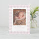 Apresente seu novo bebê com este doce e simples anúncio de nascimento de gingham rosa. A frente do clássico design apresenta um quadro de cheques cor-de-rosa e brancos com uma foto vertical solteiro junto com o tipo personalizável e grande espaço para o nome do bebê, data de nascimento, estatísticas e muito mais. O verso é um cor-de-rosa rosa empoeirado coordenado com pontos brancos e oferece espaço para uma segunda foto. Esta design faz parte da coleção de gingham "oh baby" de Lea Delaveris Design e também está disponível em outras cores e como um download digital de anúncio de nascimento. Encontre peças de coordenação como envelopes, invólucros, notas de agradecimento e muito mais na coleção.