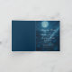 This romantic gothic wedding save the date announcement folded card features a blue skeleton couple dressed in wedding attire standing in front of the moon and ocean beach with your names and wedding date to personalize . The inside of the cared has more of your wedding details on a matching blue background. Images generated with AI.