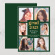 Envie a sua família e amigos um cartão moderno personalizado de graduação de colagem de fotos para os exultar. Este modelo moderno apresenta seis fotos para você mudar para seu próprio enquadramento em verde. No centro em ouro falso e tipografia branca está a palavra "Formando" com o ano, o seu nome e escola para personalizar. A parte de trás do cartão está verde. Desenhada por Susan Coffey.