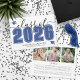 Um anúncio clássico, porém moderno, de graduação horizontal. A frente apresenta um "2025" sobredimensionado em azul-negrito com "Classe de" em preto-elegante, acentuado por um roteiro preto elegante. Dois ícones azuis de boné de formatura acrescentam um toque comemorativo, com espaço abaixo para o nome do formando e a escola. As cores podem ser personalizadas para corresponder às cores da escola para uma aparência personalizada. O verso mostra uma colagem de fotos com três pontos de imagem e espaço para uma mensagem sincera dos pais, destacando realizações e expressando orgulho.