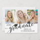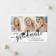 Anúncio moderno de graduação de colagem de fotos com 3 fotos na frente e 1 no verso com tipografia de script de caligrafia para o FORMANDO de título acentuado com um boné de formatura ou placa-mãe e personalizado com o nome do formando e o ano de classe em preto em um fundo branco editável — selecione uma cor diferente ou escolha entre uma variedade de planos gráficos estilizados. O verso inclui detalhes sobre o seu formando. ASSISTÊNCIA: Para obter ajuda sobre modificação/personalização do design, alterações de cor, transferência do design para outro produto ou se você quiser coordenar itens, entre em contato com o designer ANTES DE PEDIR por meio do Zazzle Chat ou makeitaboutyoustore@gmail.com.