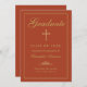 Envie a sua família e amigos um anúncio elegante de formatura cristã com um fundo laranja queimado com uma falsa caligrafia dourada e atravessado por uma fina estrutura dourada. Personalize com seus detalhes de graduação. Desenhada por Susan Coffey.
