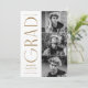 Anúncio de graduação de na moda com três fotos localizadas à direita do design em um layout vertical. "Formando" é apresentado em latão, letra moderna de arte deco. Personalize o anúncio moderno da graduação de fotos, adicionando o nome do formando, o ano de graduação e o nome da escola. A design reverte para exibir um fundo de espiral geométrico e latão branco. Perfeito para segundos graus e formandos!