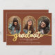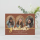 Fotos clássicas e oblongas exclusivas design de anúncio de graduação de colagem de 4 fotos, com modelos de fotos gravadas em tom dourado e texto de script em tons dourados de "formando". Adicione o nome do formando, o ano de aula e a escola à frente, juntamente com três fotos, e adicione uma foto separada e um anúncio de cheio no verso. Design original de Designs Holiday Hearts com fotos marcadoras de espaço cortesia de Omid Armin via Unsplash.