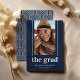 Simples cartão de lançamento de graduação 2025 com um histórico clássico azul de marinho que pode ser alterado para corresponder a qualquer escola ou cor favorita. O foco principal é no próprio formando - a foto dele tira o palco central, com duas linhas elegantes descendo de cada lado para adicionar um toque de modernidade. O resultado? Uma declaração que gritar "este é o formando!". E é claro, seu nome, escola/faculdade, e ano de aula são apresentados elegantemente, fazer que todos saibam quem é a estrela do show. O padrão ousado e geométrico no verso adiciona um toque de sofisticação, sem tirar da frente.