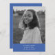 Anuncie a conquista do seu formando em estilo com este cartão de graduação simples e sofisticado. Apresentando uma foto de cheio com um fundo azul ousado, esta design destaca o nome do formando, o ano de aula e a escola em tipografia serif limpa. Perfeito para aqueles que apreciam um layout refinado e moderno que permite a palco central da foto.