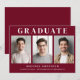 Anúncio de graduação vermelho de burgundy moderno com 3 fotos, "Formando" em tipografia branca elegante e o nome do formando, ano escolar e de aula em letras brancas limpas.