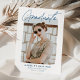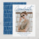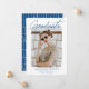 Anúncio de graduação da Tendy com a foto do formando enquadrada por uma borda branca e dura. "Formando" é exibido em um script de assinatura azul com o nome do formando, o nome da escola e o ano de graduação mostrado abaixo. O anúncio de graduação moderno se inverte para exibir um padrão único de linha impresso a azul e branco. Este cartão de anúncio de graduação de fotos é perfeito para segundos graus e formandos.
