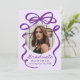 Celebre a conquista do seu formando com este anúncio elegante de graduação, com um arco roxo e design de fita ousados sobre um fundo roxo claro. A foto circular do formando é lindamente enquadrada pelo arco, enquanto o "Formando" é mostrado em um roteiro púrpura de na moda. Personalize com o nome do formando, a escola e o ano de graduação para um toque único e significativo. A parte de trás contém uma foto e um espaço adicionais para uma mensagem personalizada, fazer este design perfeito para formandos segundos graus e universitários. Compartilhe este marco especial com uma habilidade sofisticada e eterno!