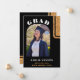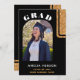 Anúncio de Graduação de Foto do Elegante Black Dourado Glitter Formando. Design moderno com falso brilho dourado em um fundo preto com nome de formando e uma foto em um quadro de arco na frente. Personalize o texto e a foto na frente e o anúncio na parte traseira.