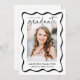 Celebre seu marco com este anúncio de graduação do Quadro de Onda Negra Moderna, com design na moda elegante e elegante. A frente mostra uma foto de formando vertical moldada por uma borda ondulada preta, com "Formando" mostrado elegantemente em um script preto manuscrito em um fundo branco nítido. Personalize-o com seu nome, ano de graduação e escola para um toque único. O verso do lançamento destaca uma foto horizontal com espaço para uma mensagem personalizada, permitindo que você compartilhe seu entusiasmo e seus planos futuros. Perfeito para formandos segundos graus e universitários, este design moderno e eterno faz uma manutenção memorável para a família e os amigos.