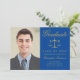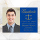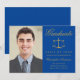 Envie a sua família e amigos um cartão de formatura de fotos personalizadas de advogado único para os fazer. Este modelo apresenta a sua fotografia personalizada à esquerda e à direita uma escamas de ouro falsas com a palavra Formando, classe/ano, nome, grau e outros detalhes da cerimônia para personalizar sobre um fundo azul real clássico. Desenhada por Susan Coffey.
