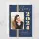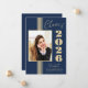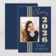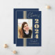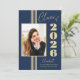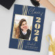 Este anúncio elegante de graduação em na moda de 2024 apresenta listras douradas, quadro fotográfico e texto em fundo azul marinho.